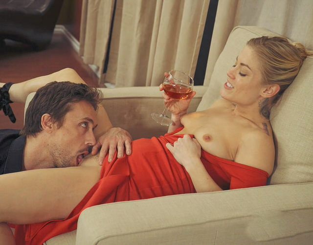 Сексуальная блондинка в красивом красном платье заглянула в апартаменты к своему любовнику, явно рассчитывающему на интимную близость. Вот только все пошло для парня не по плану. Сучка решила на первом свидании не давать, а только позволить удовлетворить себя орально. И пока девушка спокойно себе сидела в кресле и попивала вино, широко раздвинув ноги перед приятелем, тот усердно работал языком, вылизывая мокрую от возбуждения пизденку. Временами мужик делал паузу и уделял внимание ножкам партнерши.