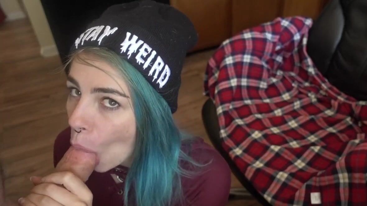 Отличное домашнее порно с молодой неформалкой и ее активным любовником. Красивая девушка с крашенными в берюзовый цвет волосами и пирсингом в носу послушно стоит на коленях, удовлетворяя своего приятеля оральным способом – облизывает ствол сверху донизу, присасывается губками к головке и старается засунуть его максимально глубоко к себе в горло. Когда ей это надоедает, приходит черед самого хахаля немного поработать, двигая поршнем туда-сюда внутри тугой девичьей киски и радуя партнершу многочисленными оргазмами.