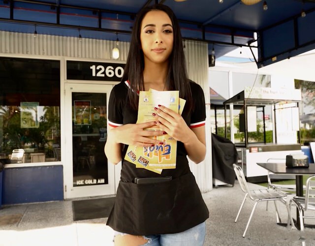 Пышная и симпатичная латинская официантка Киара сначала опасалась общения с Тони, поэтому заинтересованному в сексе парню пришлось использовать много комплиментов и наличных, чтобы она показала свои милые сиськи и провела с ним свой обеденный перерыв. Как только он вытащил девушку из ее униформы, ее распутная сторона моментально проявилась. Она сделала новому знакомому страстный минет, а потом позволила забуриться в ее сочную влажную киску. После того, как он трахнул ее во всех возможных позах, довольная девушка слизала всю кончу.