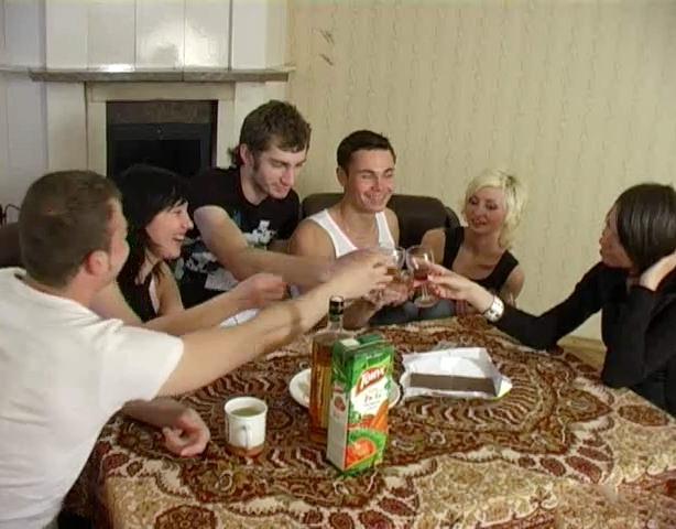 Трое парней и трое девушек решили провести вечер в дружеской обстановке, прикупив для стола разнообразного алкоголя. Дамы особенно активно налегали на алкоголь, поэтому вскоре одна из них сползла под стол и начала расстегивать джинсы своего приятеля. Сначала она долго и медленно посасывала член под одобрительное хихиканье и комментарии всей компашки, а потом улеглась на диванчик и раздвинула ноги. Парнишка сразу же запрыгнул между ними и долбил до тех пор, пока не кончил пьяной шлюшке на грудь.