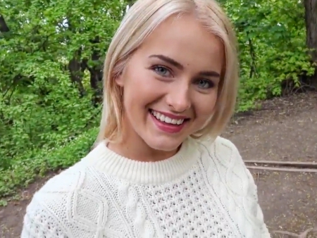 Смазливая светловолосая девушка с очень выразительным взглядом гуляла по парку. Замечательная погода располагала к сексуальным приключениям хоть она совсем о б этом не думала. И тут ей попался опытный пикапер который отлично знает как подкатывать к таким красоткам как она. Мужчина легко разводит малышку на то чтоб она показала сиськи за бабки, а потом предлагает поебаться в кустах за еще пару сотен.